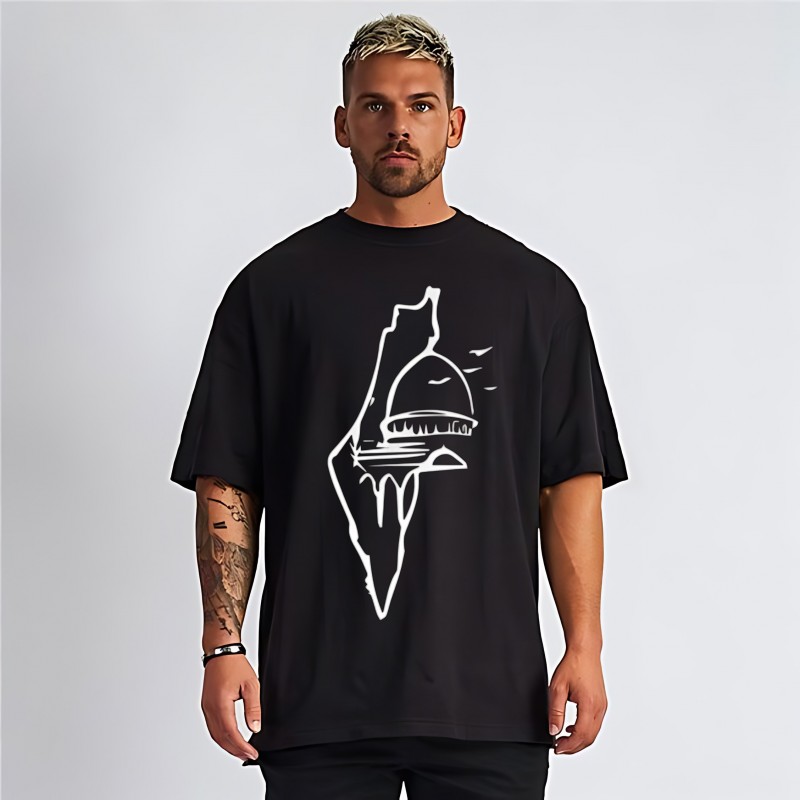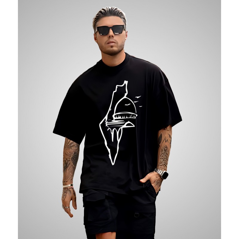 اللون الأسود اللافت يوفر تنوعاً، مما يتيح لك تنسيقه بسهولة مع الجينز أو الشورتات أو السراويل الرياضية. الميزة البارزة هي التصميم الجرافيكي الفريد على المقدمة - خريطة مفصلة لفلسطين مزينة بهيكل قبة أيقوني. هذه التمثيل الفني لا يضيف فقط لمسة جمالية بل يحتفل أيضاً بالهوية الثقافية.