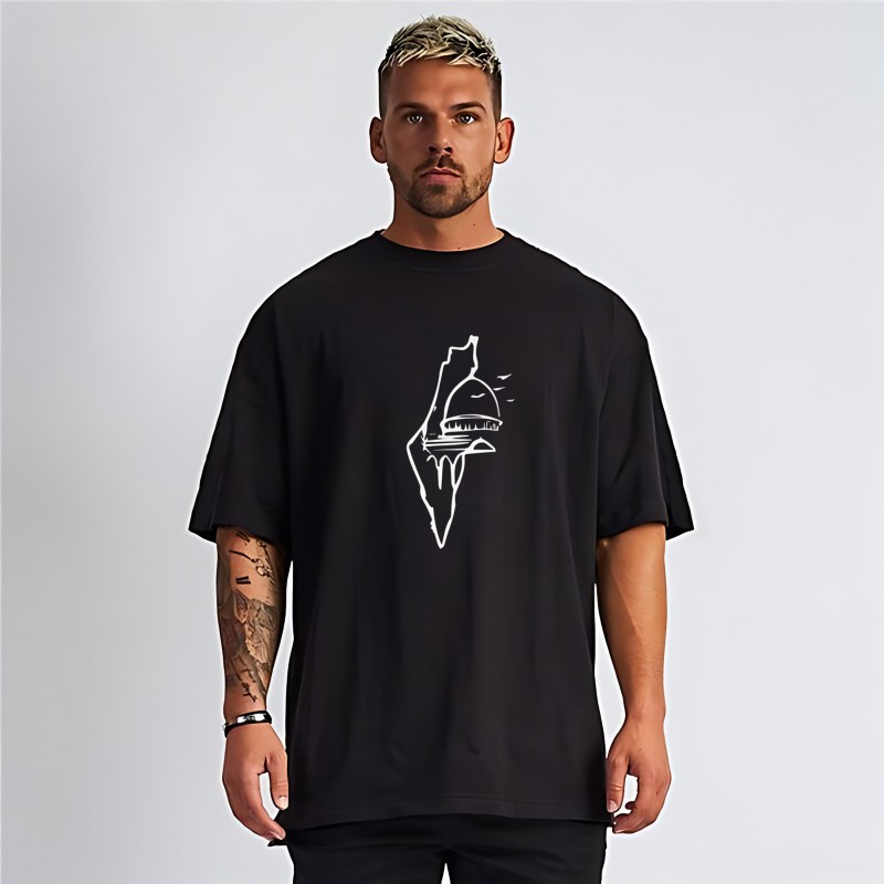 اللون الأسود اللافت يوفر تنوعاً، مما يتيح لك تنسيقه بسهولة مع الجينز أو الشورتات أو السراويل الرياضية. الميزة البارزة هي التصميم الجرافيكي الفريد على المقدمة - خريطة مفصلة لفلسطين مزينة بهيكل قبة أيقوني. هذه التمثيل الفني لا يضيف فقط لمسة جمالية بل يحتفل أيضاً بالهوية الثقافية.
