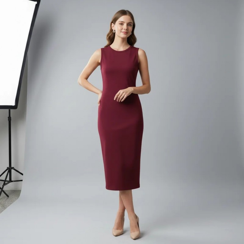 فستان ميدي بدون أكمام بلون بورغندي أنيق