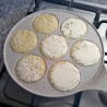 The utensil features a round, flat pan with seven shallow indentations, allowing you to cook multiple pancakes simultaneously. Each indentation is perfectly sized for standard pancakes, ensuring even cooking and optimal flavor absorption. Made from a light-colored, possibly non-stick material, this pan guarantees easy release of your pancakes while promoting even heating across the surface.