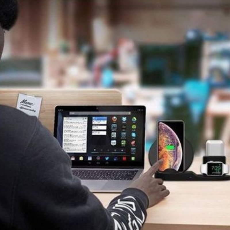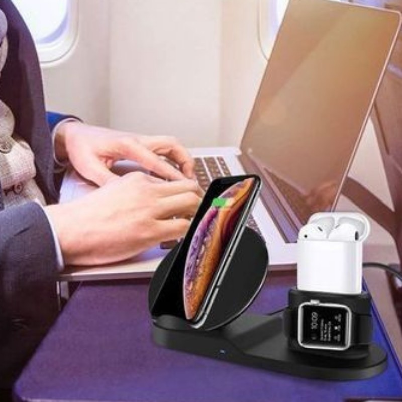 Effortlessly charge your smartphone, smartwatch, and earphones simultaneously with this sleek wireless charging station.
