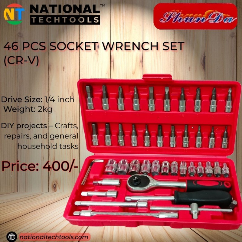 The 46 PCS Socket Wrench Set (CR-V) from National Techtools is an essential toolkit for any DIY enthusiast or professional. Featuring a robust selection of 1/4 inch drive sockets, this set is crafted from durable chrome vanadium steel for long-lasting performance. Weighing just 2kg, it's lightweight yet powerful enough for a wide range of applications including crafts, repairs, and general household tasks. Conveniently organized in a sturdy case, this set ensures you have the right tool at your fingertips for any project.