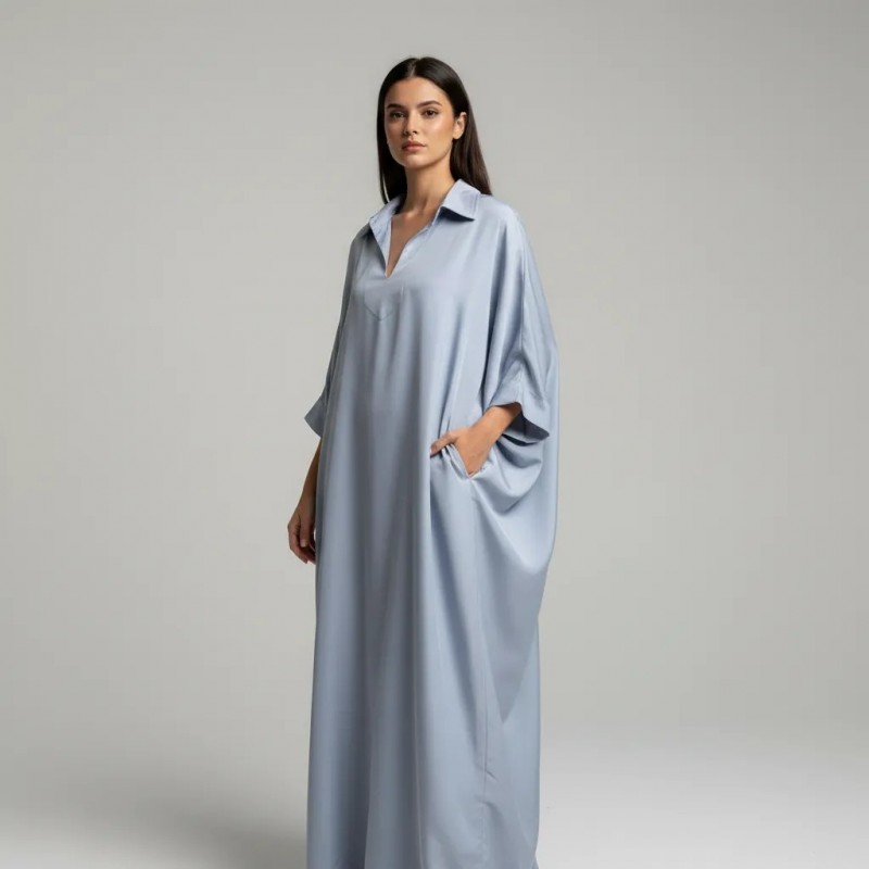 A stylish and comfortable blue kaftan dress, perfect for any occasion.