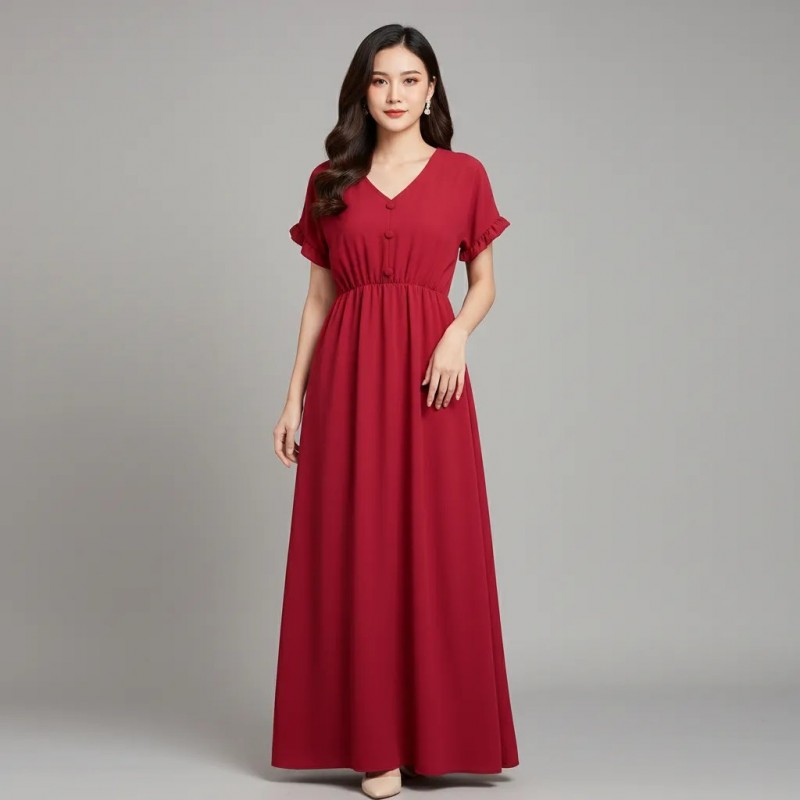 This stunning burgundy maxi dress offers a perfect blend of elegance and comfort. Crafted from high-quality fabric, it features a flattering V-neckline and ruffled sleeves that add a touch of sophistication. The elastic waistband ensures a tailored fit while the flowing skirt provides graceful movement. Whether you're attending a formal event or enjoying a casual day out, this dress promises to be a versatile addition to your wardrobe.