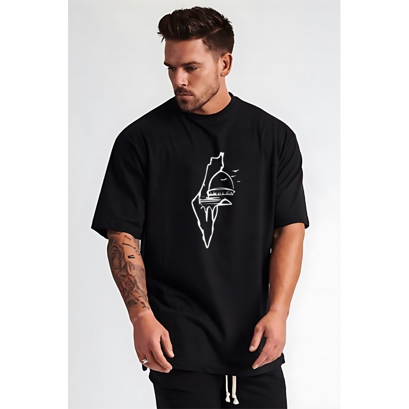 The striking black color provides versatility, allowing you to pair it effortlessly with jeans, shorts, or joggers. The standout feature is the unique graphic design on the front—a detailed map outline of Palestine adorned with an iconic dome structure. This artistic representation not only adds flair but also celebrates cultural identity.