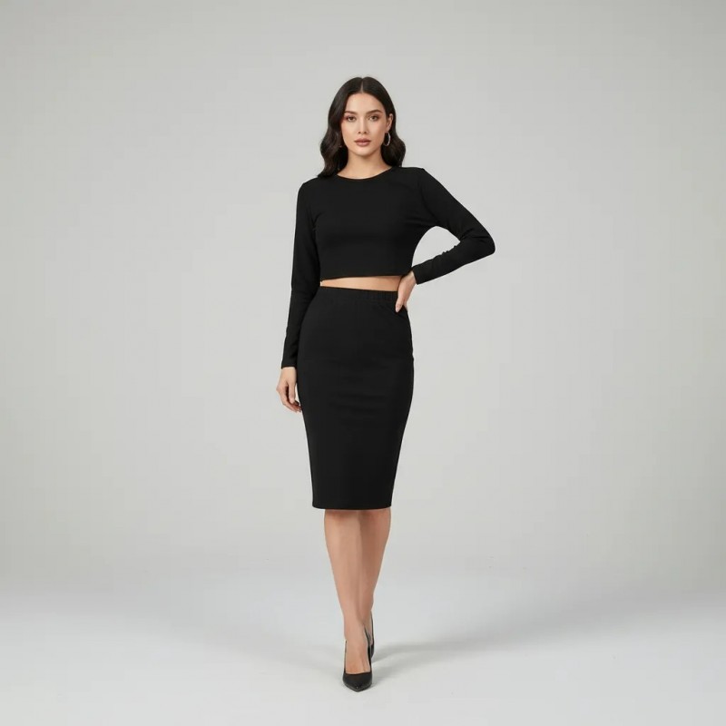 Entrez dans la sophistication avec notre Ensemble Chic Noir en Deux Pièces, comprenant un crop top à manches longues élégant et une jupe crayon ajustée. Cette tenue est conçue pour flatter votre silhouette tout en offrant un confort ultime. Idéale pour des occasions décontractées ou formelles, cet ensemble intemporel est un incontournable de votre garde-robe. Associez-le à des talons pour un look sophistiqué ou optez pour des ballerines pour une sortie décontractée.