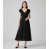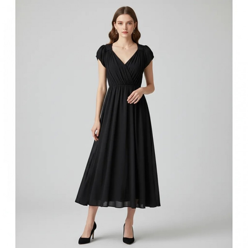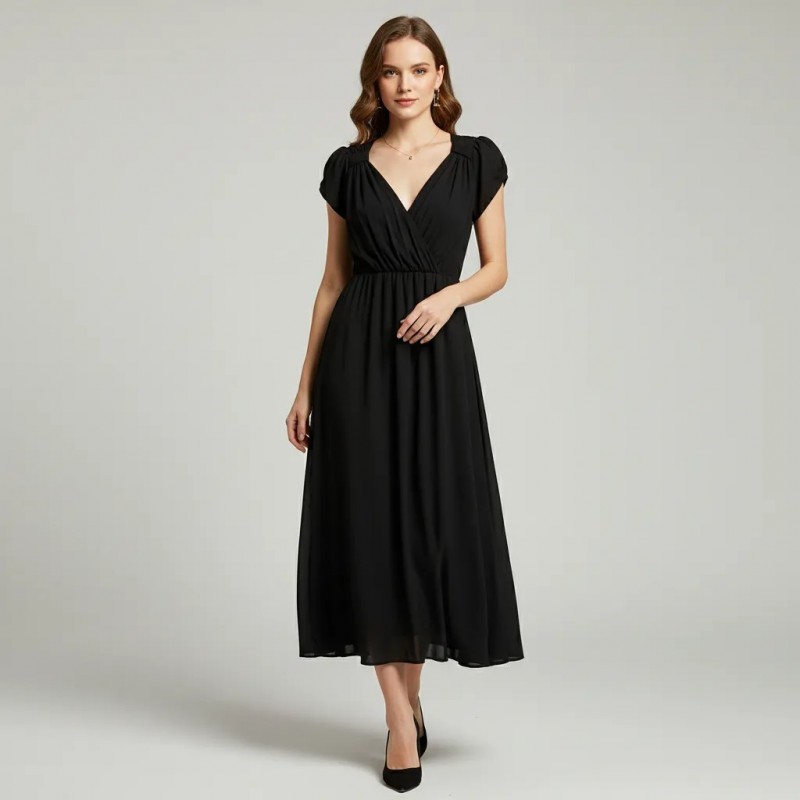 Cette robe midi noire élégante est un incontournable de votre garde-robe, avec un décolleté en V flatteur et des manches courtes qui ajoutent une touche de sophistication. Fabriquée en tissu de haute qualité, elle tombe magnifiquement, offrant à la fois confort et style. La taille cintrée et la jupe fluide créent une silhouette gracieuse, parfaite pour le jour comme pour le soir. Associez-la à vos talons et accessoires préférés pour compléter un look éblouissant.