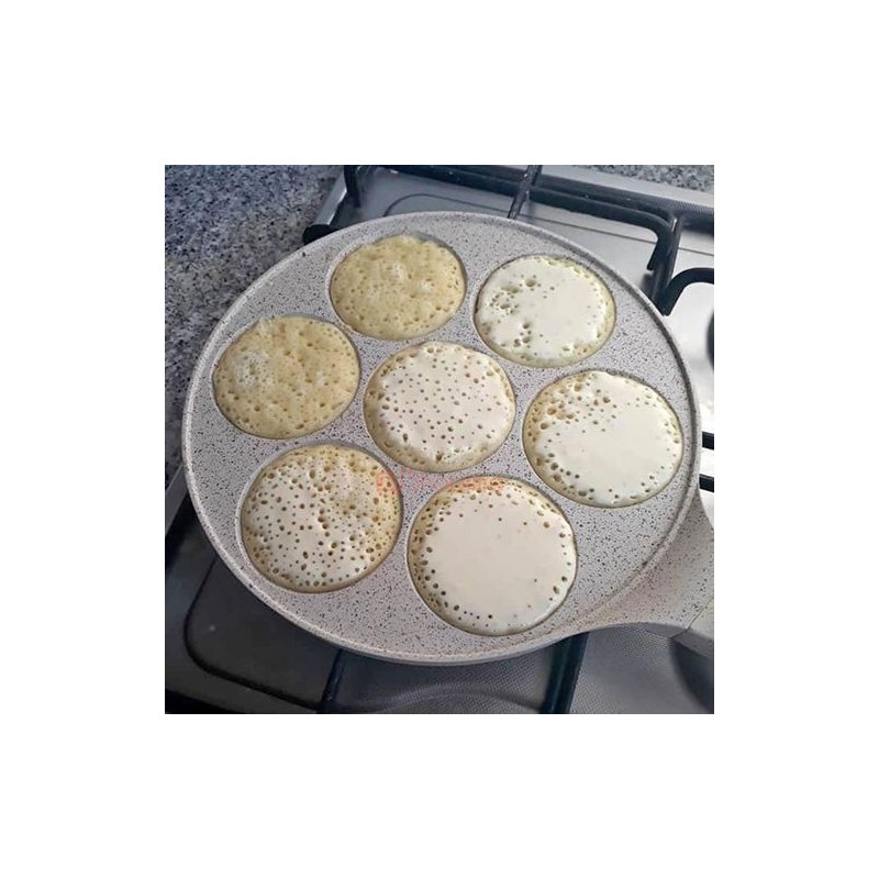 L'ustensile dispose d'une poêle ronde et plate avec sept indentations peu profondes, vous permettant de cuire plusieurs crêpes simultanément. Chaque indentation est parfaitement dimensionnée pour des crêpes standard, garantissant une cuisson uniforme et une absorption optimale des saveurs. Fabriquée à partir d'un matériau de couleur claire, possiblement antiadhésif, cette poêle garantit un démoulage facile de vos crêpes tout en favorisant un chauffage uniforme sur la surface.